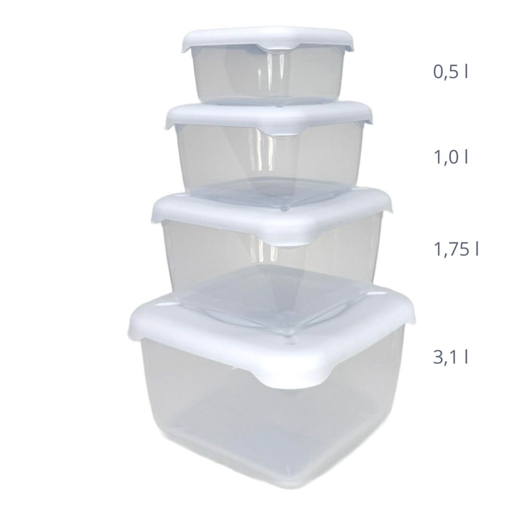 Sada FRIGOBELLA zahrnuje 3+1 dóz s objemy 0,5 l, 1,0 l, 1,75 l, 3,1 l, díky čemuž pokryje široké spektrum potřeb od uchovávání zbytků jídla po přípravu na vaření či mražení větších porcí. Všechny nádoby odolávají teplotám od -30 °C do +100 °C, takže jsou vhodné pro použití v mrazáku i mikrovlnné troubě. Lze je bez obav mýt v myčce, a po dosloužení je celý set plně recyklovatelný. Dózy se dají stohovat do sebe, což šetří místo při skladování.