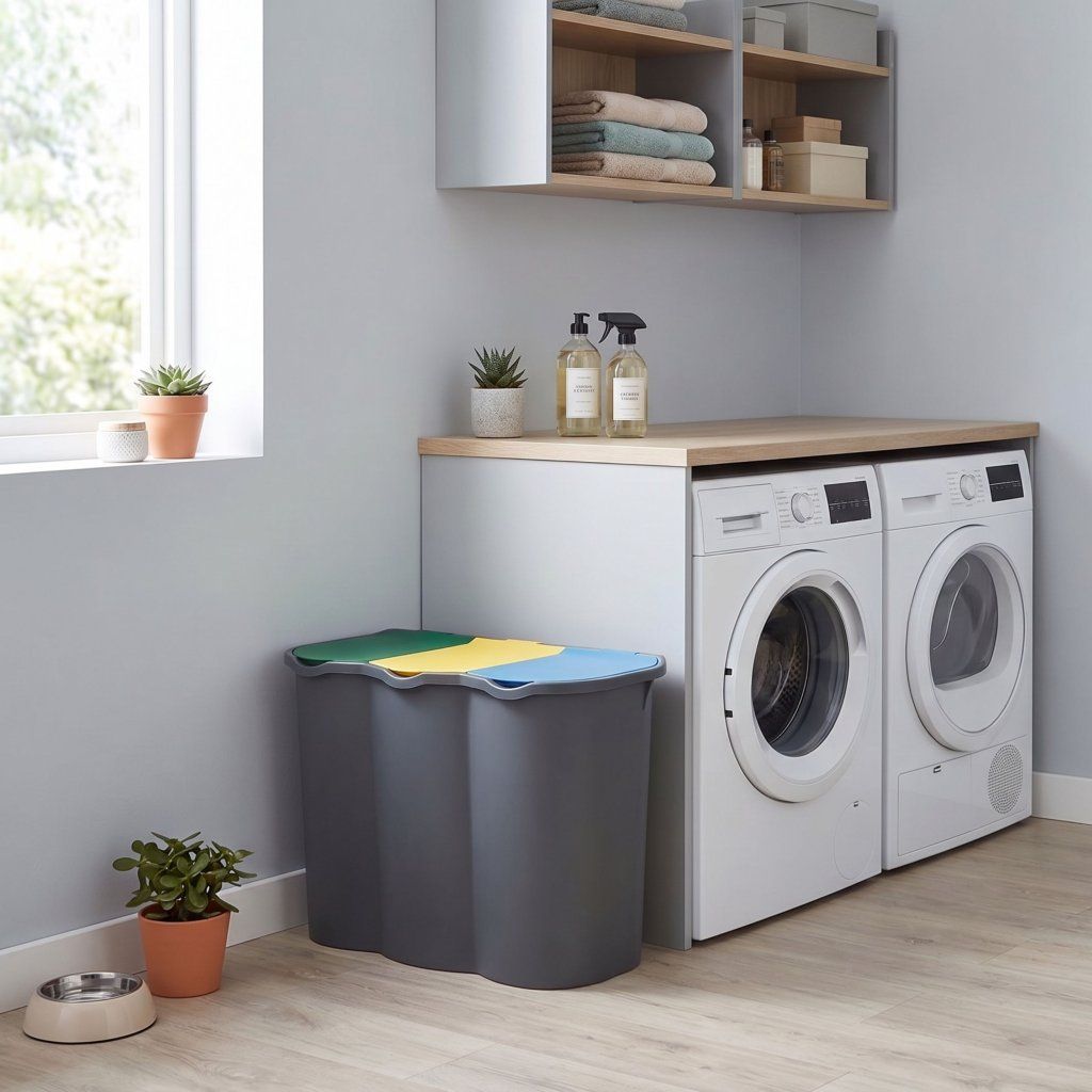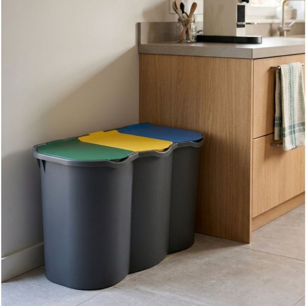 Sestava na tříděný odpad je tvořena jednou nádobou se třemi otvory, které umožňují efektivní a přehledné třídění odpadu dle barev – žlutá pro plast, zelená pro sklo a modrá pro papír. Každá nádoba je vybavena praktickým rámečkem pro snadné uchycení odpadkového sáčku. Výměna sáčku je rychlá a bezproblémová, což zajišťuje komfort při každodenním používání. Celkový objem sestavy je 80 litrů, což nabízí dostatečnou kapacitu při zachování kompaktních rozměrů. Díky plastovému provedení je koš velmi lehký, snadno se přenáší a čistí, a přitom si zachovává vysokou odolnost vůči běžnému opotřebení.