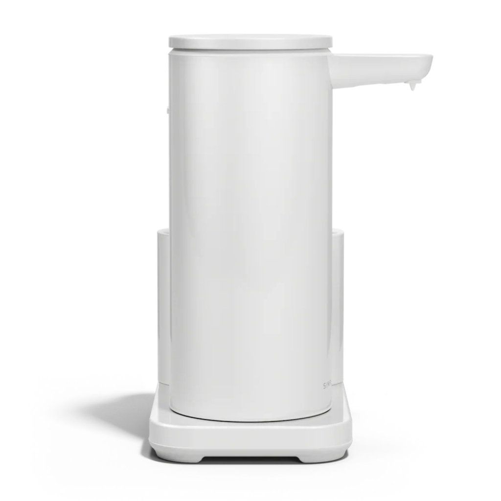 Bezdotykový dávkovač mýdla Simplehuman – 414 ml + držák na houbičku,bílá ocel