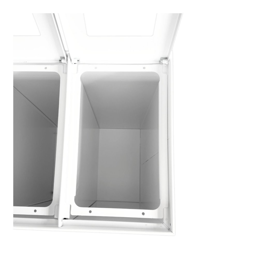 Horní víka s centrálními otvory umožňují snadné vhazování odpadu a zároveň udržují esteticky čistý vzhled. Víka jsou kompletně z práškově lakované oceli, pevně připevněna šrouby a lze je snadno odklopit pro výměnu vnitřních sáčků. Díky ocelovým držákům, které jsou ke konstrukci připevněny šrouby, je manipulace se sáčky jednoduchá a hygienická. Stabilní základna s ochranou podlahy Základna z ocelového plechu je vybavena pěnovým profilem, který chrání podlahu před poškrábáním a zajišťuje stabilitu kontejneru i při častém používání. Vnitřní části jsou odděleny ocelovými deskami s epoxidovou povrchovou úpravou, což zaručuje dokonalé rozdělení jednotlivých přihrádek a snadné třídění odpadu.