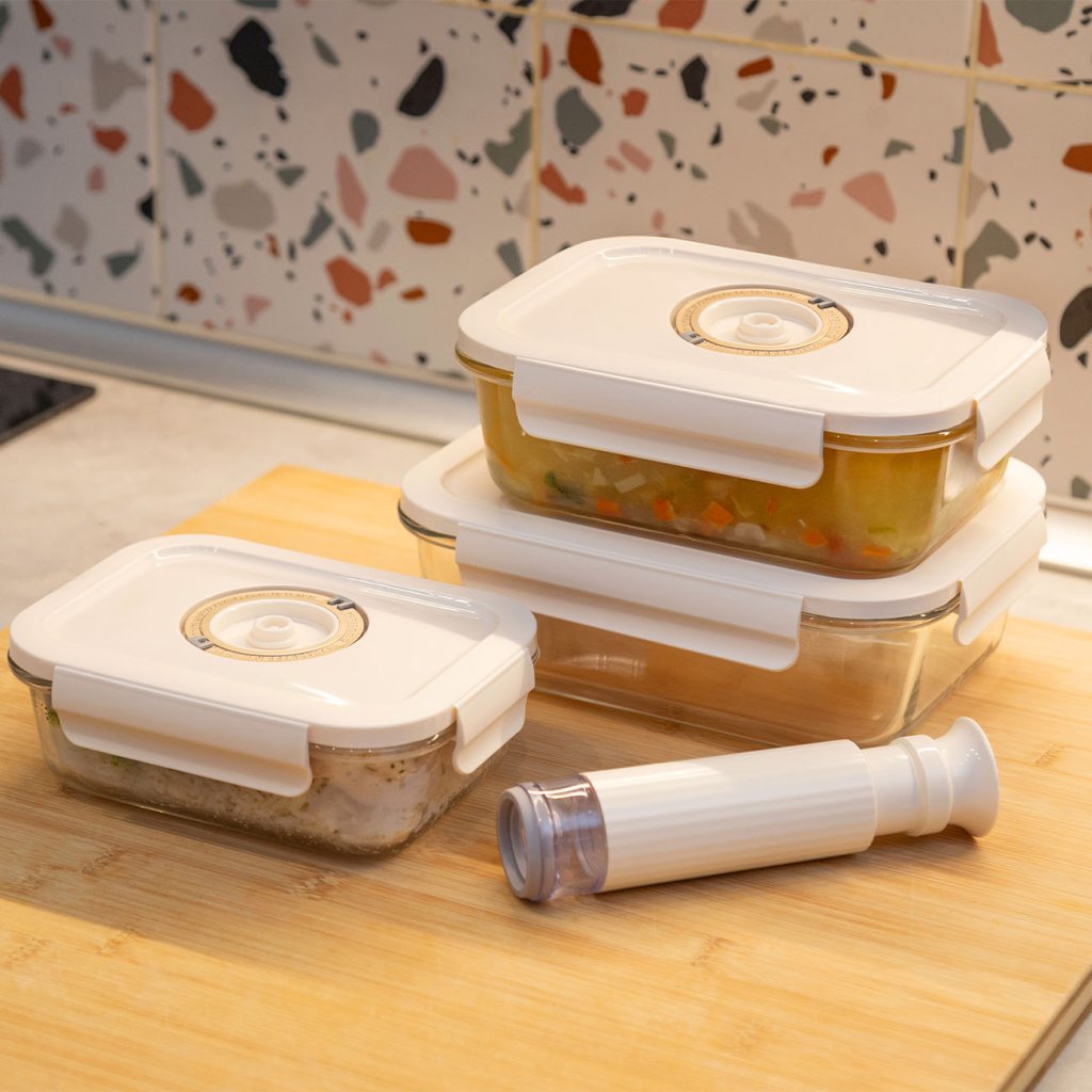 Skleněné vakuovací dózy na potraviny ASPIFRESH představují praktické a chytré řešení pro uchovávání potravin s prodlouženou čerstvostí. Ať už skladujete ovoce, zeleninu, maso, sýry nebo zbytky z oběda, dózy ASPIFRESH pomohou udržet potraviny až třikrát déle čerstvé, chutné a bezpečné. Jsou ideální pro každodenní použití, přípravu jídel předem (meal prep), zamrazování, ohřev v mikrovlnné troubě (bez víčka) nebo jako nádoby na servírování.