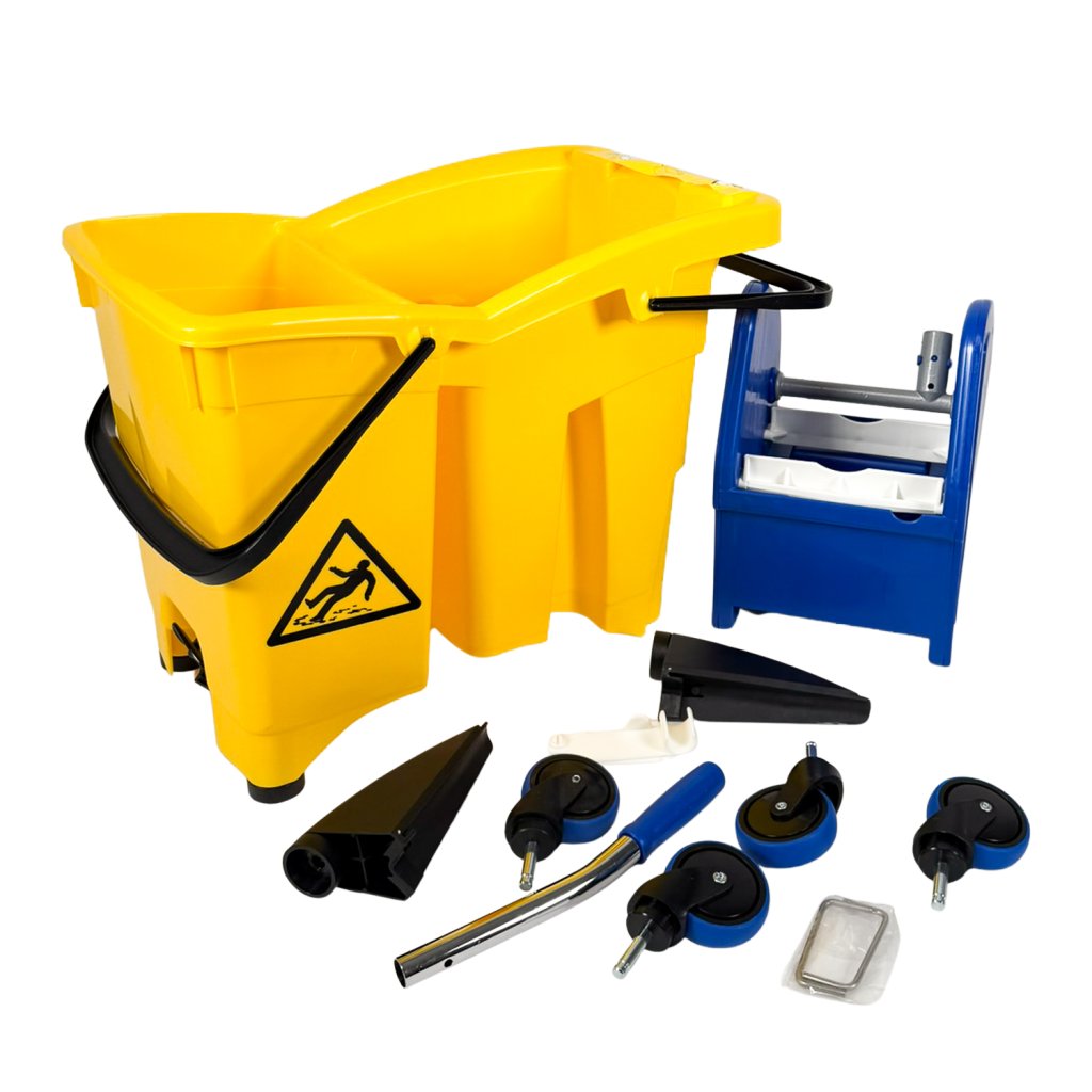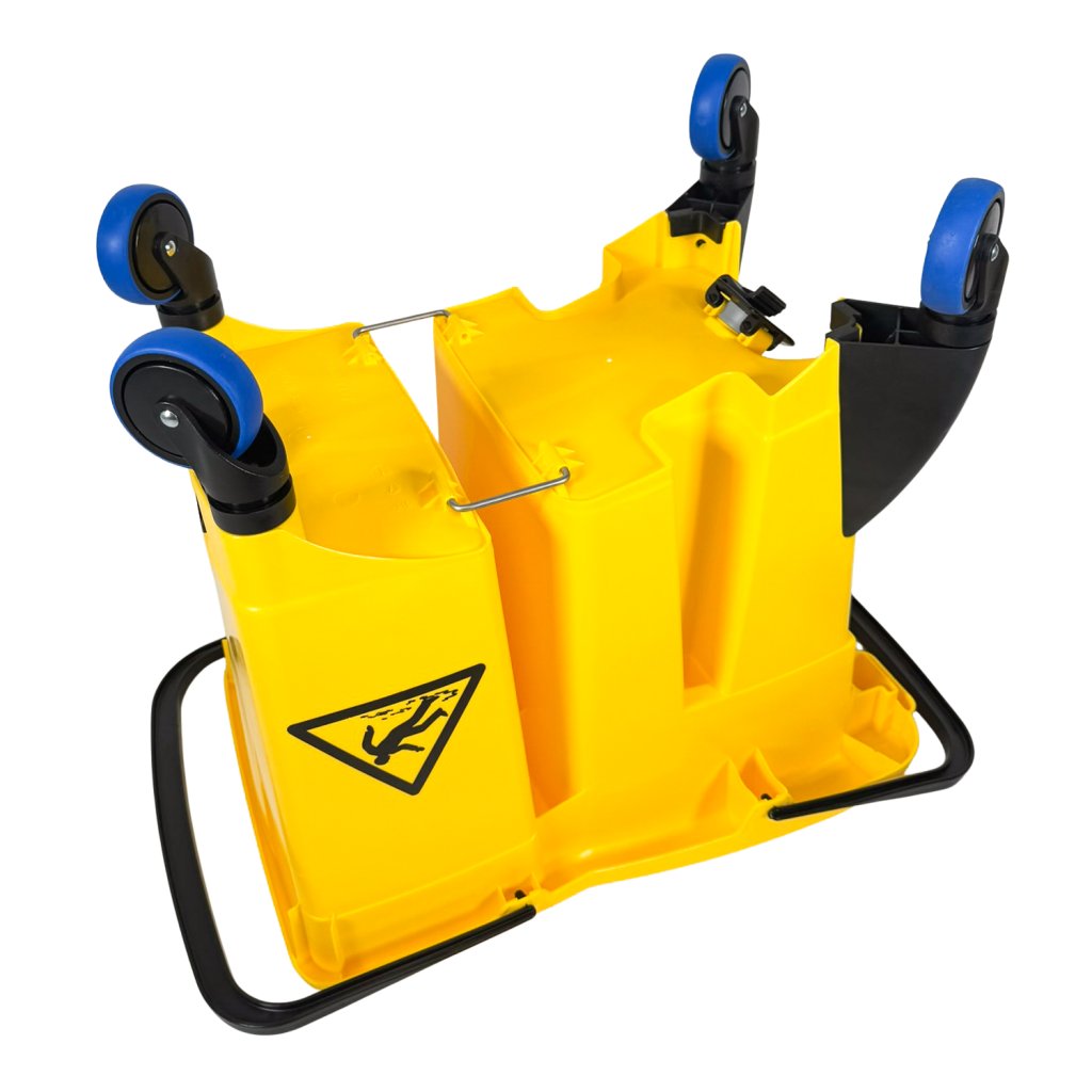 Součástí vozíku je lis na mop s držákem a čtyři otočná kolečka, která zajišťují plynulý pohyb i ve stísněných prostorách. Konstrukce je vyrobena z odolného plastu, který zvládne každodenní profesionální použití a je snadno omyvatelný.