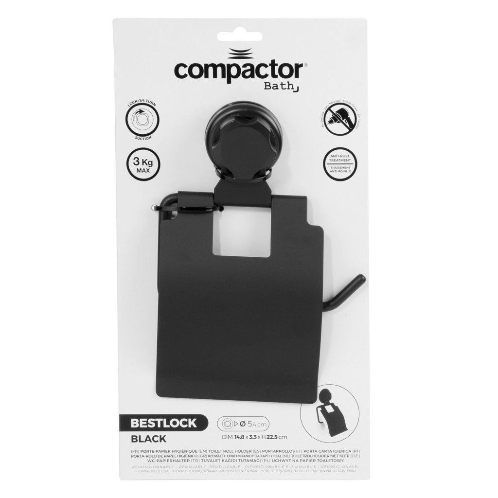 Držák na toaletní papír Compactor Bestlock Black, systém s přísavkou - bez vrtání