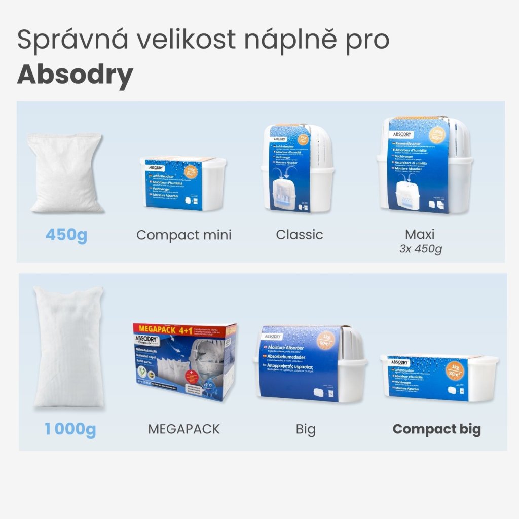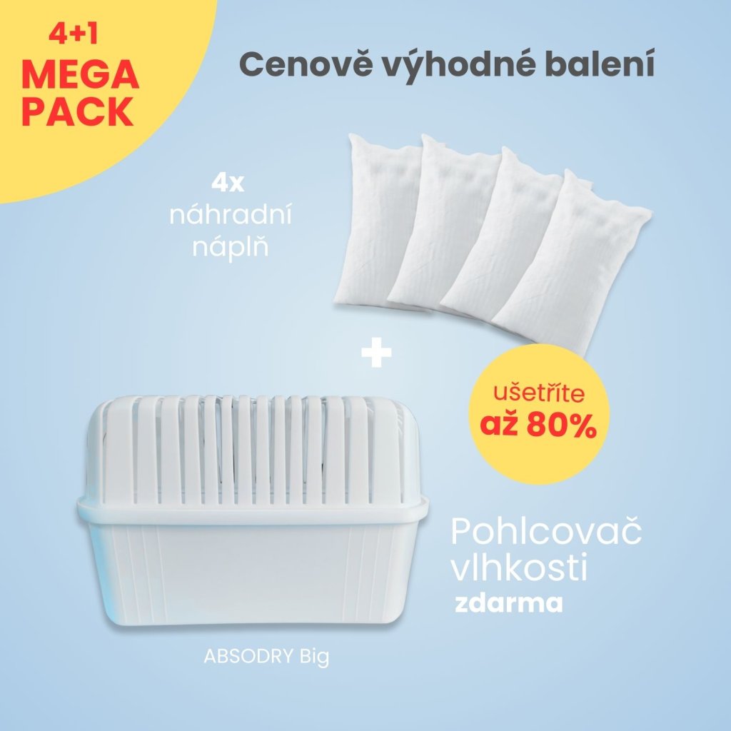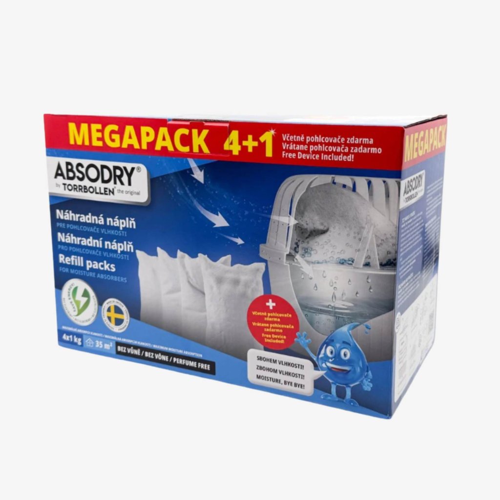 Balení obsahuje pohlcovač Absodry Big a 4 náhradní náplně, přičemž koupí megapacku ušetříte až 417 Kč než při nákupu jednotlivých produktů samostatně. Náplň o hmotnosti 1 kg vydrží až 90 dní v závislosti na vlhkosti a teplotě prostředí, takže vám 4 náplně vydrží celou sezónu.