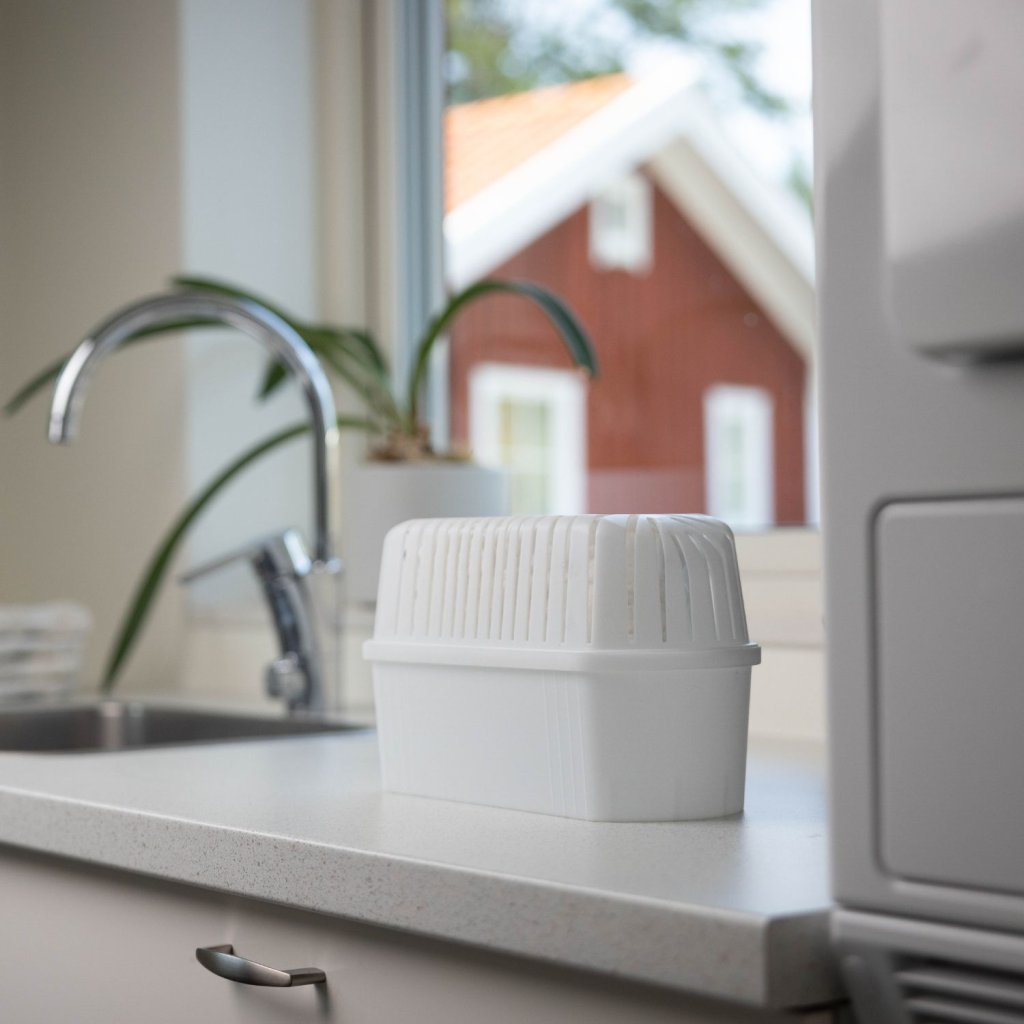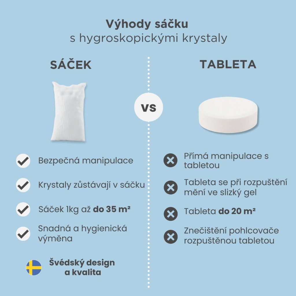 Na rozdíl od elektrických odvlhčovačů funguje zcela bez spotřeby energie a tiše. Díky speciálním absorpčním krystalům účinně odstraňuje nadbytečnou vlhkost a zápach - krystaly na sebe vážou vlhkost ze vzduchu, která následně kondenzuje a stéká do spodní nádržky. Navíc neobsahují žádnou parfemaci, takže je pohlcovač ideální do domácností s dětmi a alergiky.