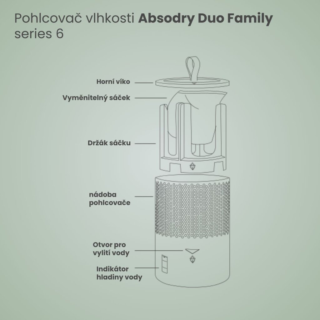 Použití pohlcovače Absodry je rychlé a hlavně hygienické – vložíte sáček s krystaly, uzavřete víko a přístroj bude sám pracovat. Díky praktickému indikátoru hladiny vody přesně uvidíte, kdy je potřeba spodní nádržku vyprázdnit. Kondenzovanou vodu jednoduše vylejete do odtoku přes vypouštěcí otvor. Po spotřebování náplně následně stačí vložit nový sáček bez nutnosti čištění zbytků rozpuštěné tablety.