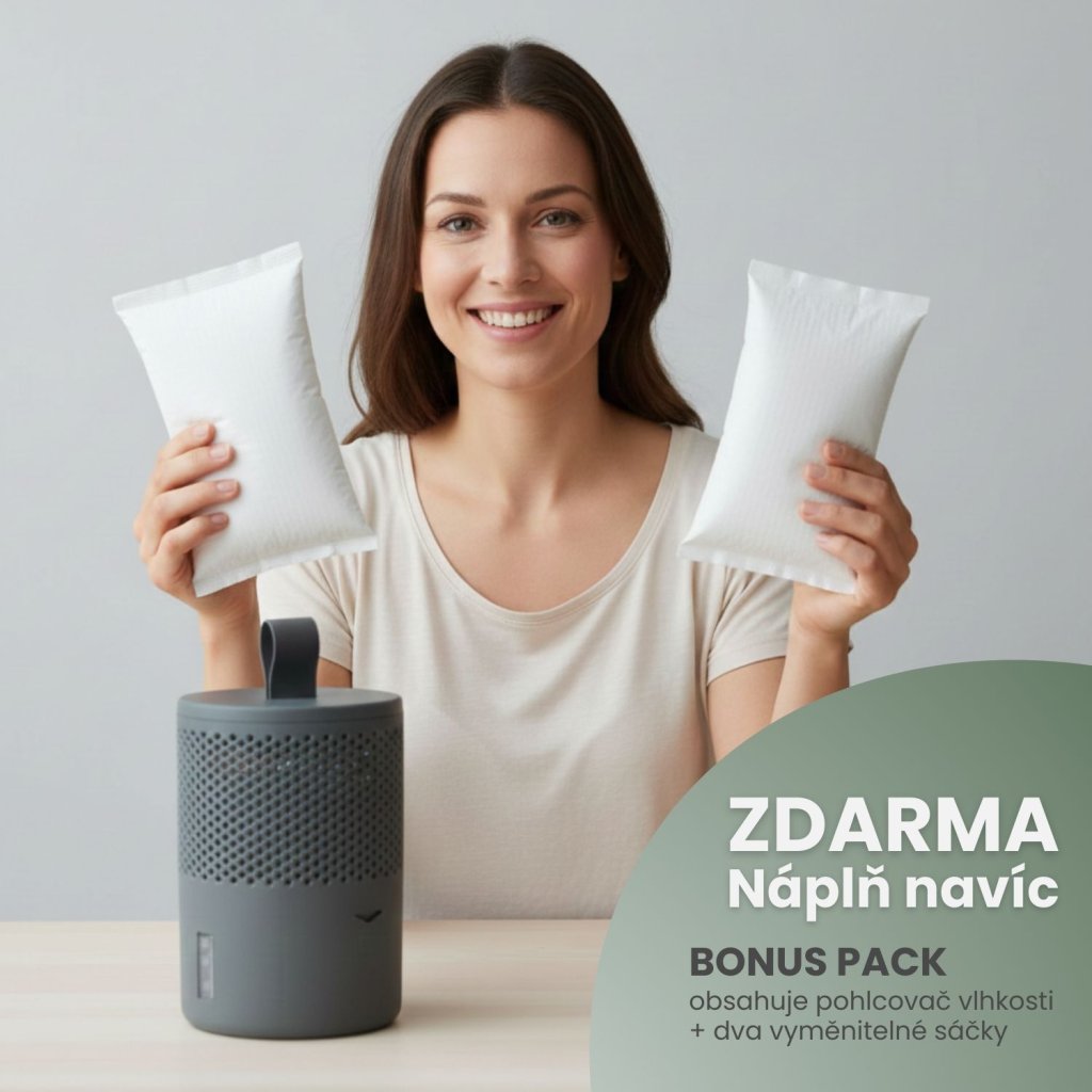 Na rozdíl od elektrických odvlhčovačů funguje zcela bez spotřeby energie a tiše. Speciální hygroskopické krystaly uvnitř přístroje na sebe vážou vlhkost ze vzduchu, která následně kondenzuje a stéká do spodní nádržky. Absorpční krystaly navíc neobsahují žádnou parfemaci, takže je pohlcovač ideální do domácností s dětmi a alergiky. Součástí balení je 1 náplň, která vydrží až 90 dní v závislosti na vlhkosti v místnosti - v BONUS packu získáte rovnou 2 náplně pro delší provoz bez starostí.