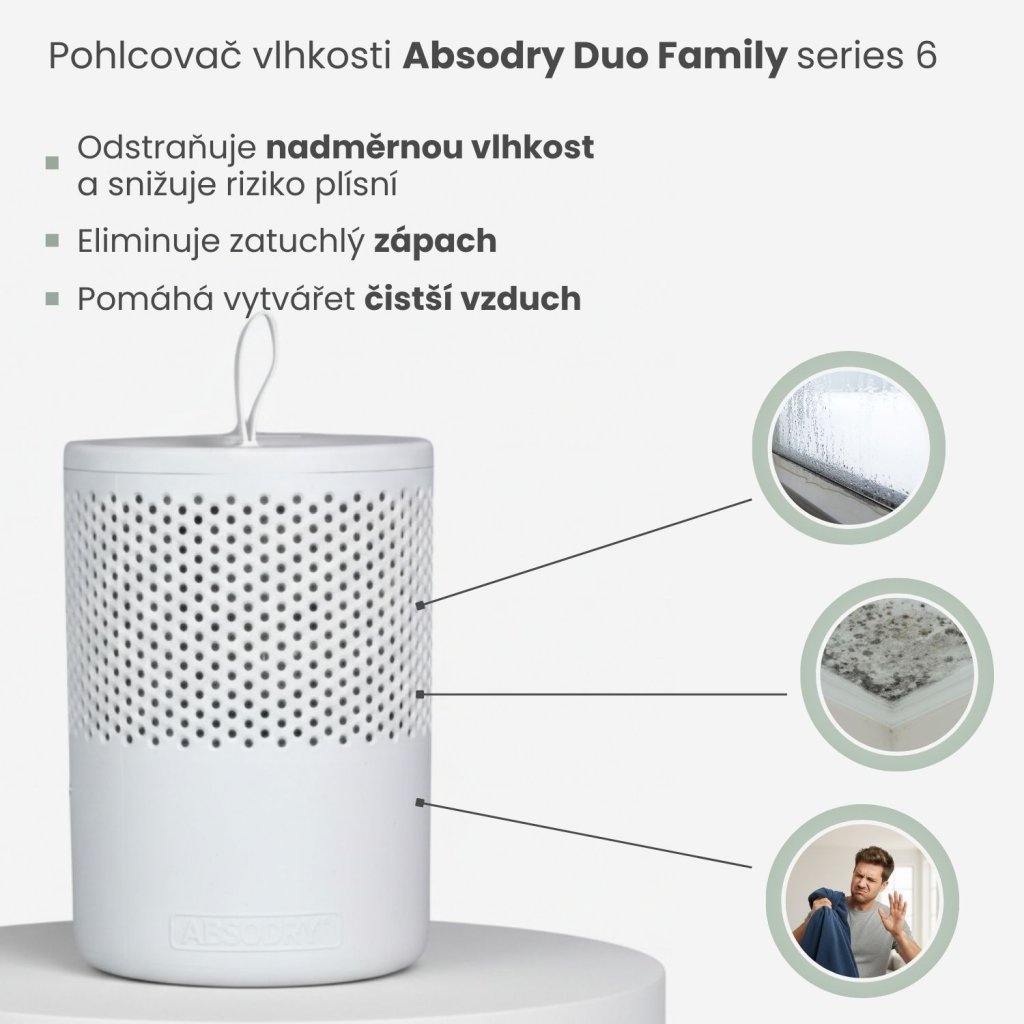 Absodry Duo Family od švédské značky Everbrand je designový pohlcovač vlhkosti, který spojuje funkčnost a skandinávský minimalismus. Díky speciálním absorpčním krystalům účinně odstraňuje nadbytečnou vlhkost a zápach, zatímco jeho čistý tvar a trendy barvy se dokonale hodí do každého interiéru.
