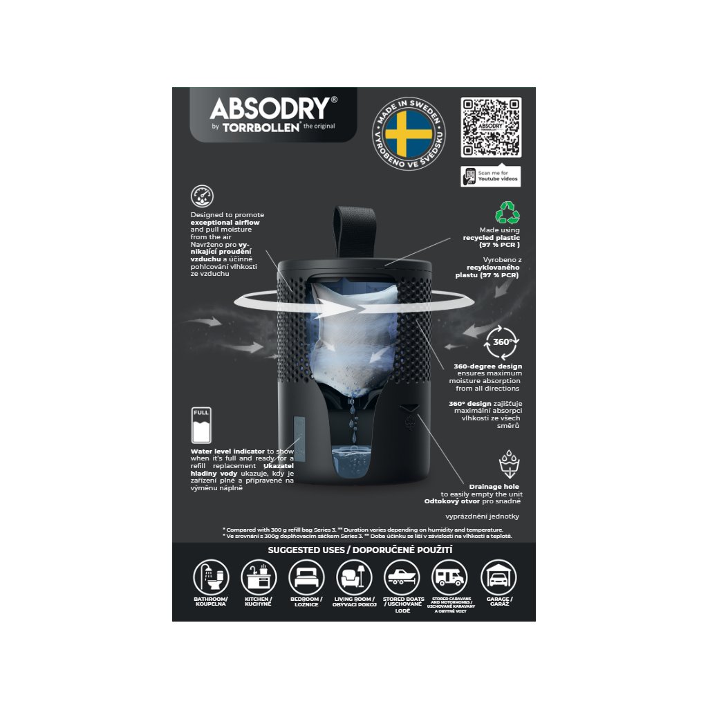 S přebytečnou vlhkostí se nejčastěji setkáváme v koupelně či v kuchyni. Pokud je překročena ideální hladina vlhkosti (40-60 %), hrozí vznik alergie či dýchacích obtíží.Pohlcovač vlhkosti Absodry vás ohromí tím, kolik vzdušné vlhkosti dokáže zachytit během několika dní. Váš domov se tak opět stane bezpečným prostředím pro vás i vaše nejbližší.