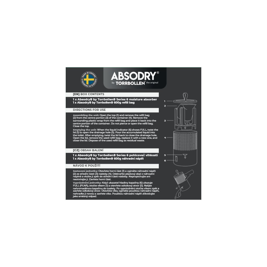Součástí balení je jeden sáček hygroskopických krystalů, které je potřeba vyndat z plastového obalu a vložit přímo do středu pohlcovače. Podle množství vzdušné vlhkosti ve vašem interiéru, budou krystaly absorbovat vlhkost až po dobu 90 dní. Ve chvíli, kdy hladina kondenzované vody dosáhne maxima, je nutné nádržku vyprázdnit.Tyto krystaly jsou neškodné vůči životnímu prostředí a vašemu zdraví.Bezpečnostní listy je možno stáhnout jako přílohu u každého výrobku Everbrand.