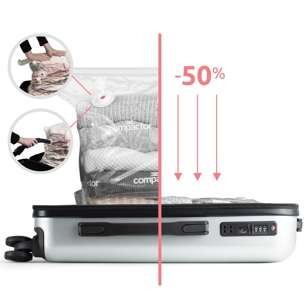 Compactor představuje unikátní cestovní zavazadlo s patentovanou technologií Hybrid Luggage, které nabízí o 50% více úložného prostoru než běžný kufr stejné velikosti. Jedna polovina cestovního kufru je vybavena integrovaným vakuovým pytlem se dvěma ventily, což umožňuje odsátí přebytečného vzduchu a zmenšení objemu uloženého oblečení. Nyní si můžete vzít na dovolenou všechny oblíbené kousky, které by se vám do běžného kufru už nevešly. V nabídce naleznete 3 velikosti kufrů v různých designech, které uspokojí nároky jednotlivce, páru i celé rodiny.