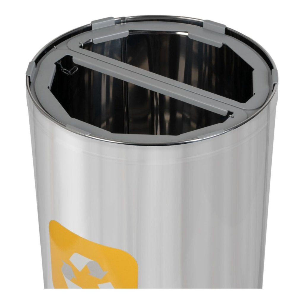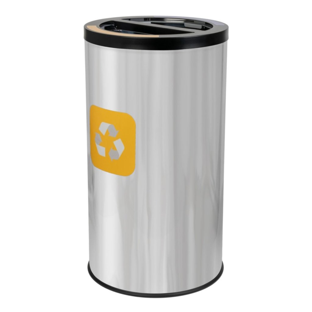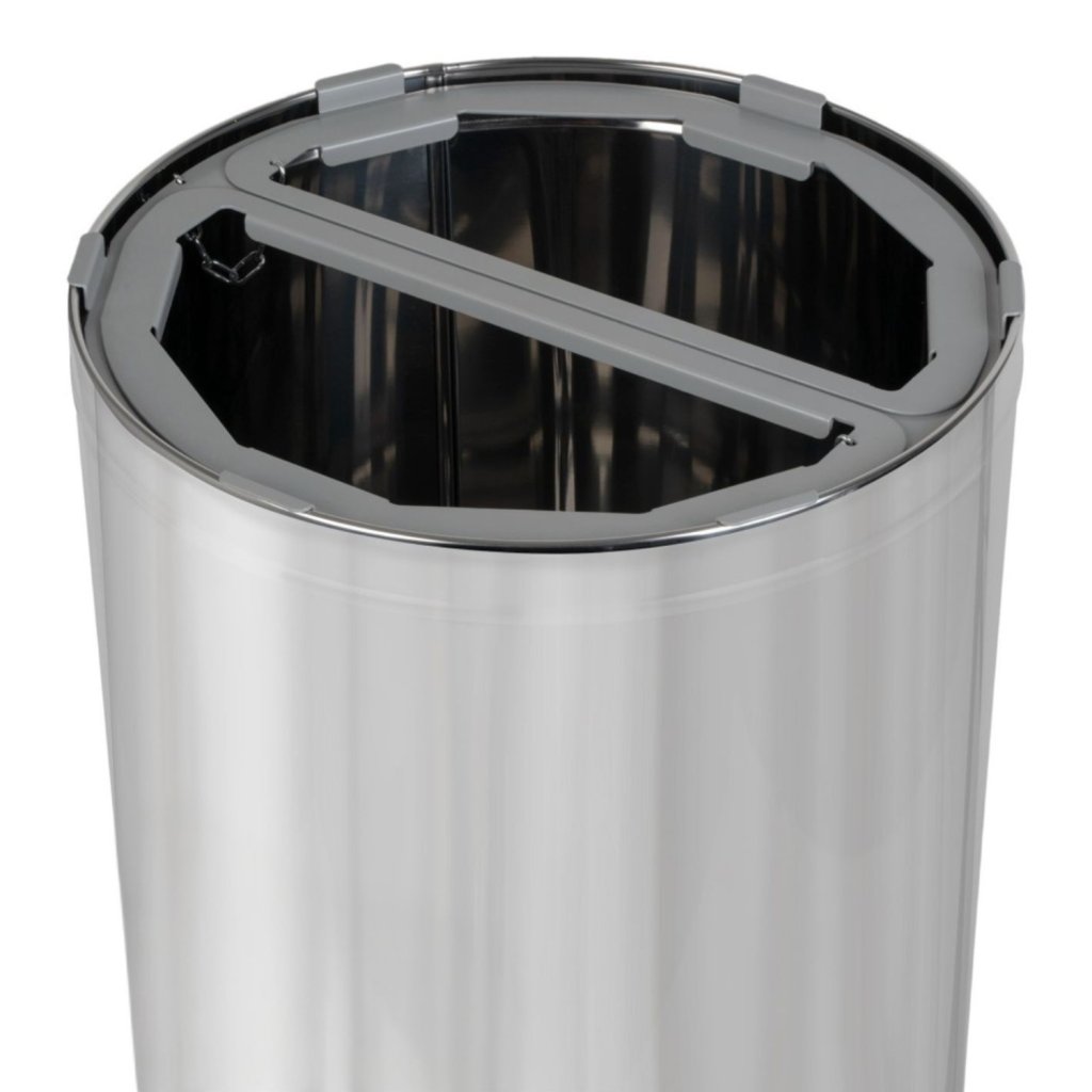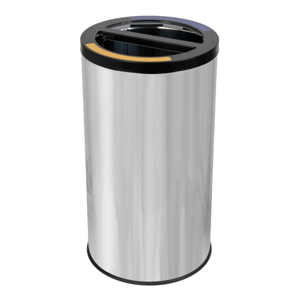 Tento kulatý koš na třídění odpadu se dvěmi komorami po 35 l je navržen pro každodenní použití v prostorách s vysokými nároky na čistotu a efektivitu. Držáky na pytle usnadňují vysypávání odpadu, zatímco robustní konstrukce zajišťuje stabilitu a dlouhou životnost. Práškově lakovaný povrch chrání proti poškrábání a korozi, takže koš si uchovává svůj moderní vzhled i při intenzivním používání. Díky barevným značením u otvorů je třídění intuitivní a vhodné i pro veřejné prostory.