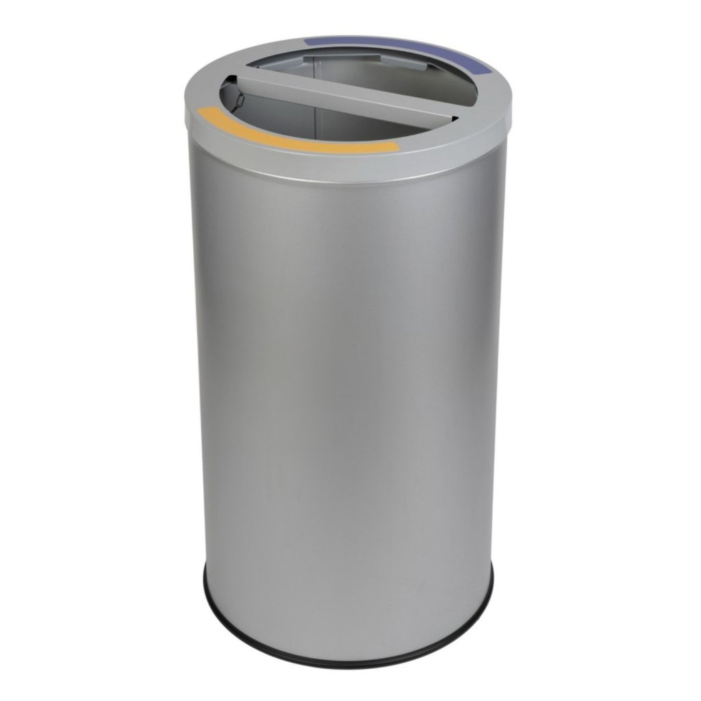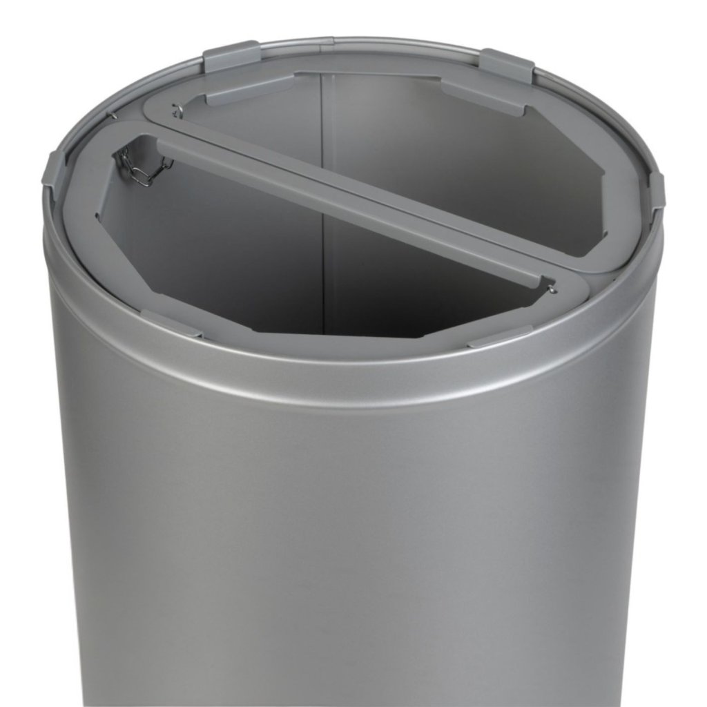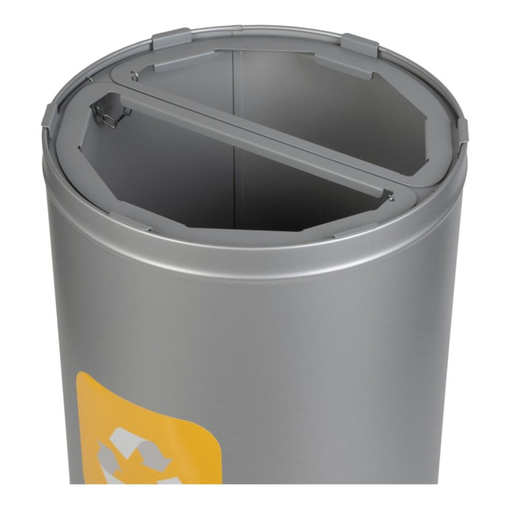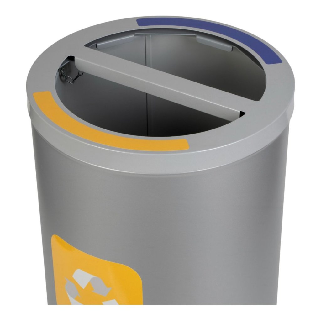 Tento kulatý koš na třídění odpadu se dvěmi komorami po 35 l je navržen pro každodenní použití v prostorách s vysokými nároky na čistotu a efektivitu. Držáky na pytle usnadňují vysypávání odpadu, zatímco robustní konstrukce zajišťuje stabilitu a dlouhou životnost. Práškově lakovaný povrch chrání proti poškrábání a korozi, takže koš si uchovává svůj moderní vzhled i při intenzivním používání. Díky barevným značením u otvorů je třídění intuitivní a vhodné i pro veřejné prostory.