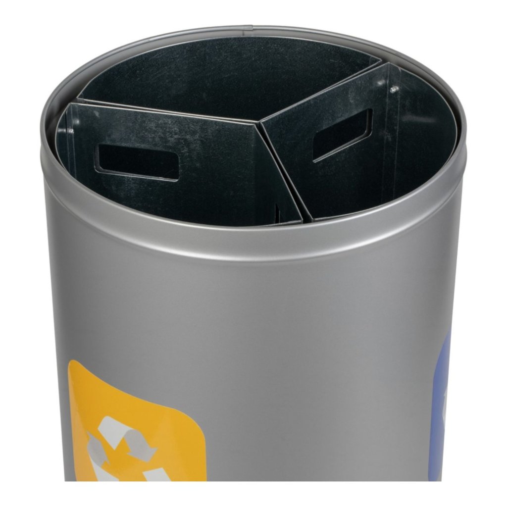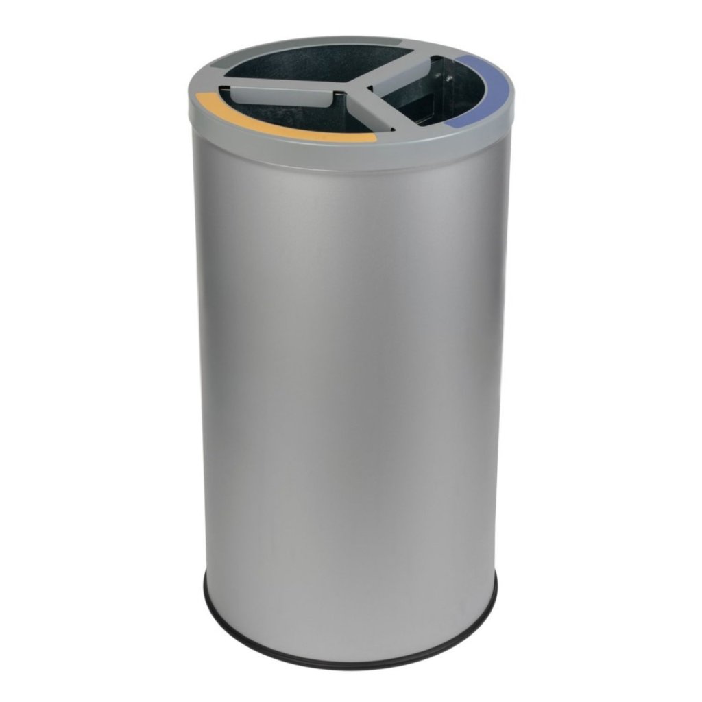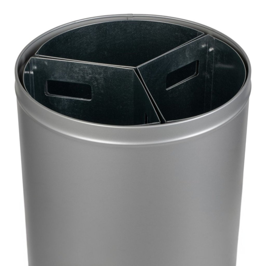 Tento kulatý koš na třídění odpadu se třemi komorami po 20 l je navržen pro každodenní použití v prostorách s vysokými nároky na čistotu a efektivitu. Ocelové vložky usnadňují vysypávání a čištění, zatímco robustní konstrukce zajišťuje stabilitu a dlouhou životnost. Práškově lakovaný povrch chrání proti poškrábání a korozi, takže koš si uchovává svůj moderní vzhled i při intenzivním používání. Díky barevným značením u otvorů je třídění intuitivní a vhodné i pro veřejné prostory.
