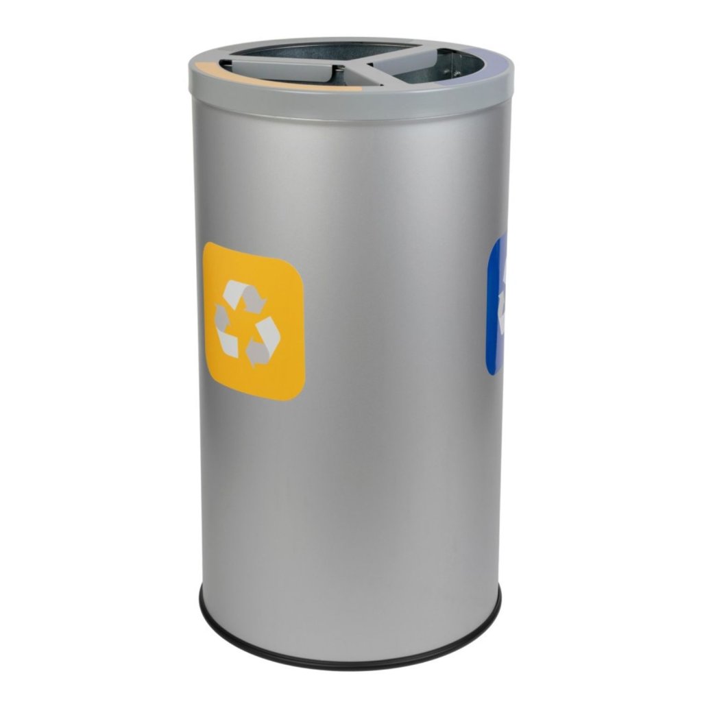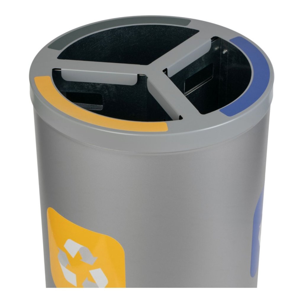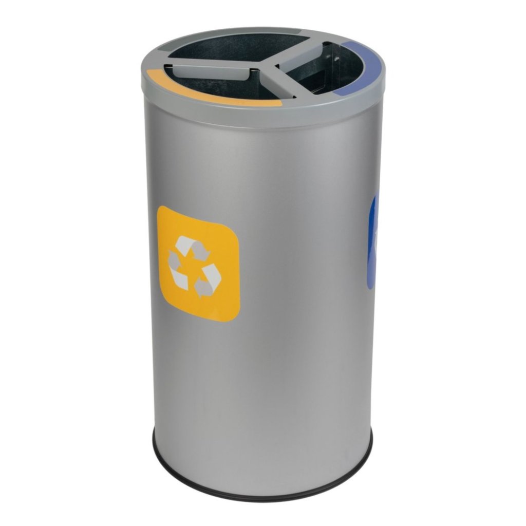 Tento kulatý koš na třídění odpadu se třemi komorami po 20 l je navržen pro každodenní použití v prostorách s vysokými nároky na čistotu a efektivitu. Ocelové vložky usnadňují vysypávání a čištění, zatímco robustní konstrukce zajišťuje stabilitu a dlouhou životnost. Práškově lakovaný povrch chrání proti poškrábání a korozi, takže koš si uchovává svůj moderní vzhled i při intenzivním používání. Díky barevným značením u otvorů je třídění intuitivní a vhodné i pro veřejné prostory.