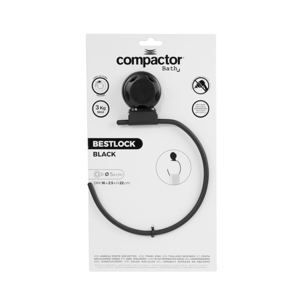 Organizace vaší koupelny nikdy nebyla tak snadná. S patentovaným systémem Bestlock se vyhnete poškození povrchu vrtáním či lepením, a přesto můžete celou koupelnu vybavit praktickými poličkami, držáky či háčky. Věšák na ručníky Compactor v moderním černém provedení s antikorozní úpravou okamžitě vyřeší problém s úložným prostorem ve vaší koupelně, a zároveň bude vítaným designovým doplňkem.