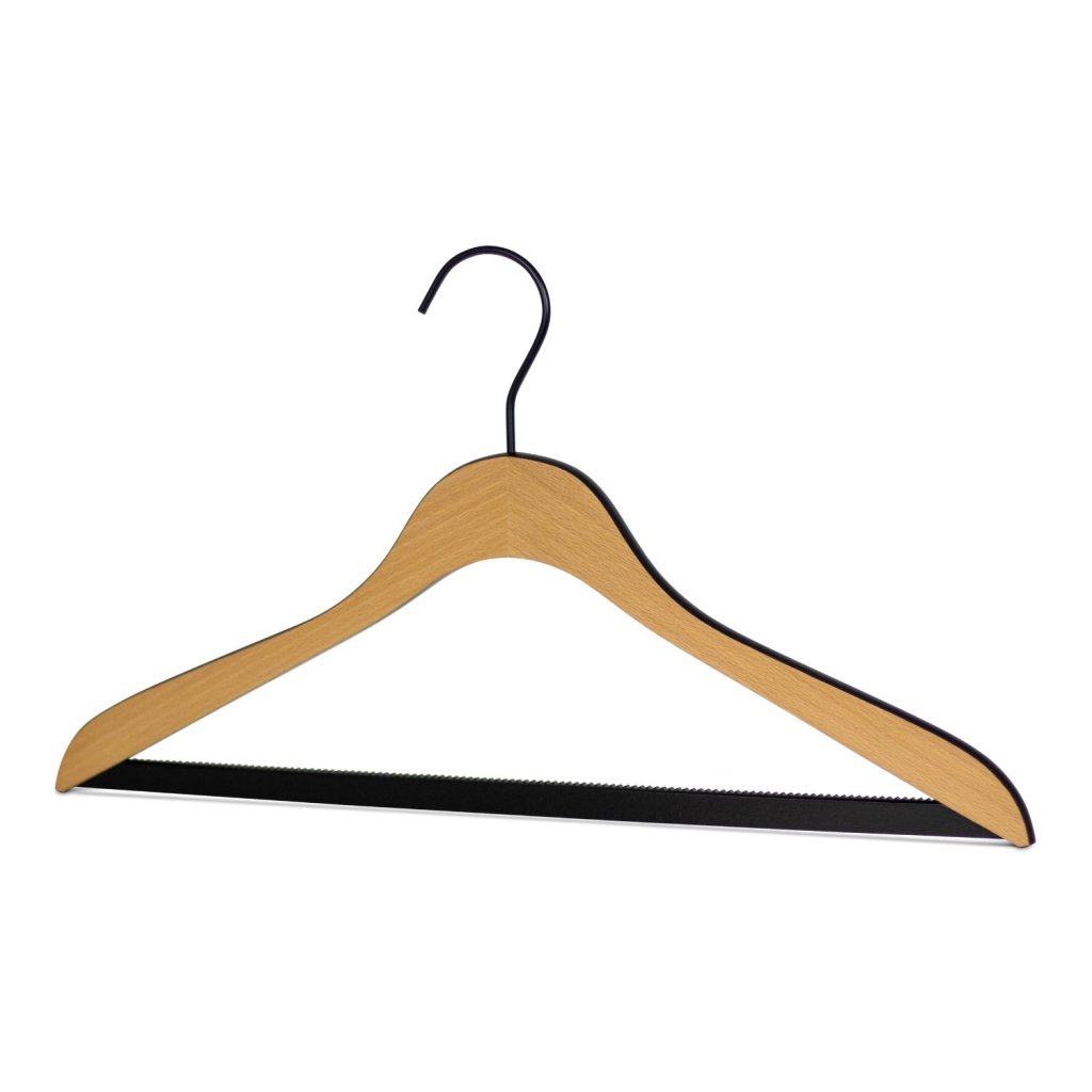 z certifikovaného masivního dřeva na svrchní oděvy – trička, košile, halenky, bundy, kabáty unikátní design – světlé dřevo s černou konturou díky plochému provedení šetří až 30% místa ve skříni s otočným háčkem...
