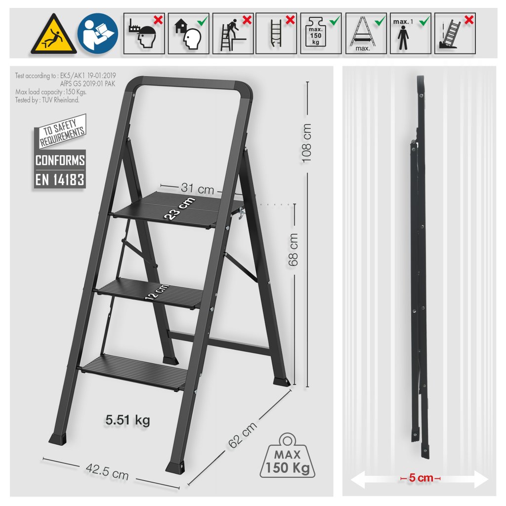 Díky pevné konstrukci unesou až 150 kg a odpovídají přísným bezpečnostním normám GS. Protiskluzové schůdky poskytují stabilitu a bezpečnost při každém kroku, zatímco gumové nožičky chrání podlahu před poškrábáním. Štafle jsou navrženy tak, aby byly ve složeném stavu extrémně ploché, což usnadňuje jejich skladování i v malých prostorech.