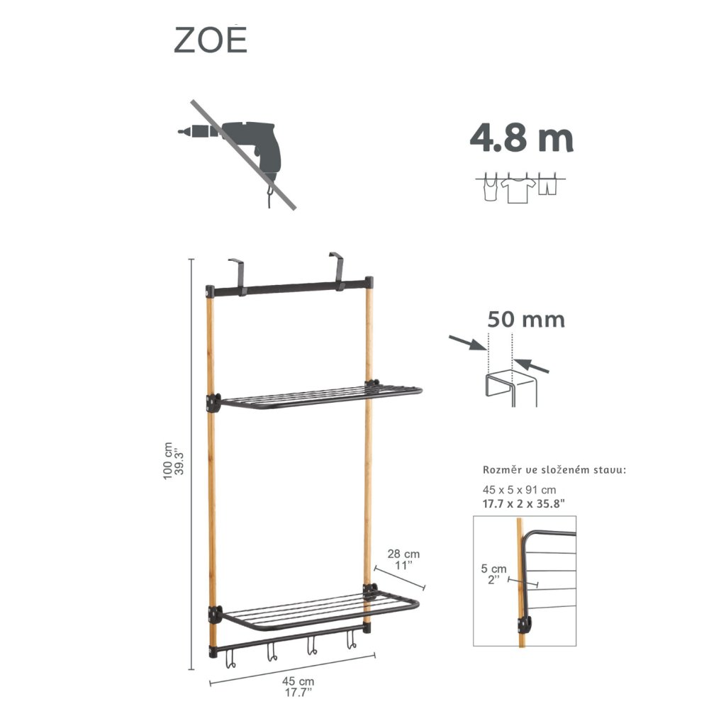Sušák nabízí dvě prostorné úrovně s celkovou sušící plochou 4,8 metru, doplněné o praktické háčky na ručníky, které umožňují přehledné a efektivní sušení. Kombinace matné černé oceli a přírodního bambusu dodává sušáku moderní industriální vzhled, který se snadno sladí s různými styly koupelen. Po složení má sušák hloubku pouhých 5 cm, takže nepřekáží a lze jej snadno uskladnit.