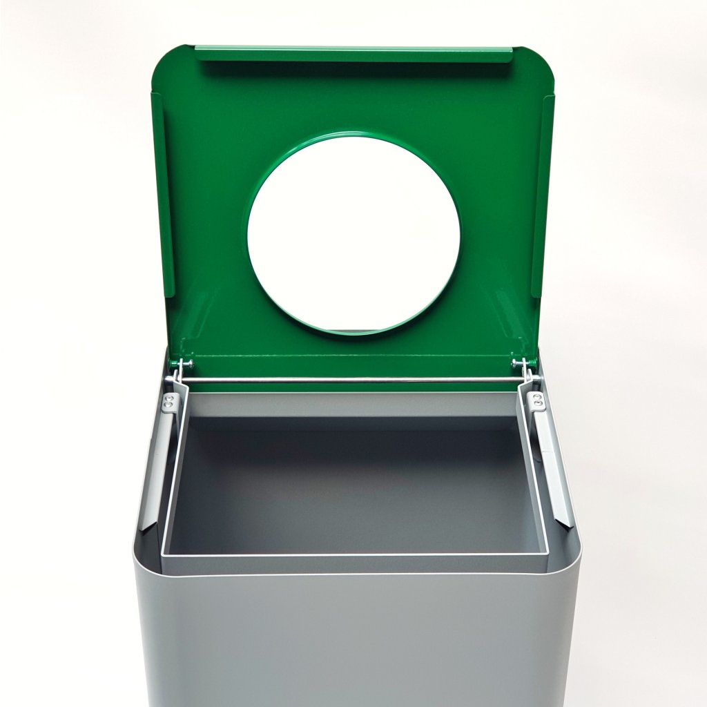 Horní část koše s otvorem neslouží jen pro vhazování odpadu, ale také jako prostředek pro barevné označení jednotlivých nádob pro konkretní typ odpadu. V Evropské unii máme již mnoho let zaveden systém rozlišování odpadu dle barvy a toto barevné označení košů je nejenom praktické z hlediska rozlišení, ale tyto barvy dávají celému prostoru veselejší tvář a působí radost.a pocit čistoty. Klasicky žlutá znamená prostor pro plasty, modrá pro papír, zelená pro tmavé sklo a bílá pro bílé sklo. Méně používaná je červená barva, která znamená drobný elektroodpad. A standardně šedá barva ukazuje na směsný odpad, který je samozřejmě také součástí třídění odpadu.