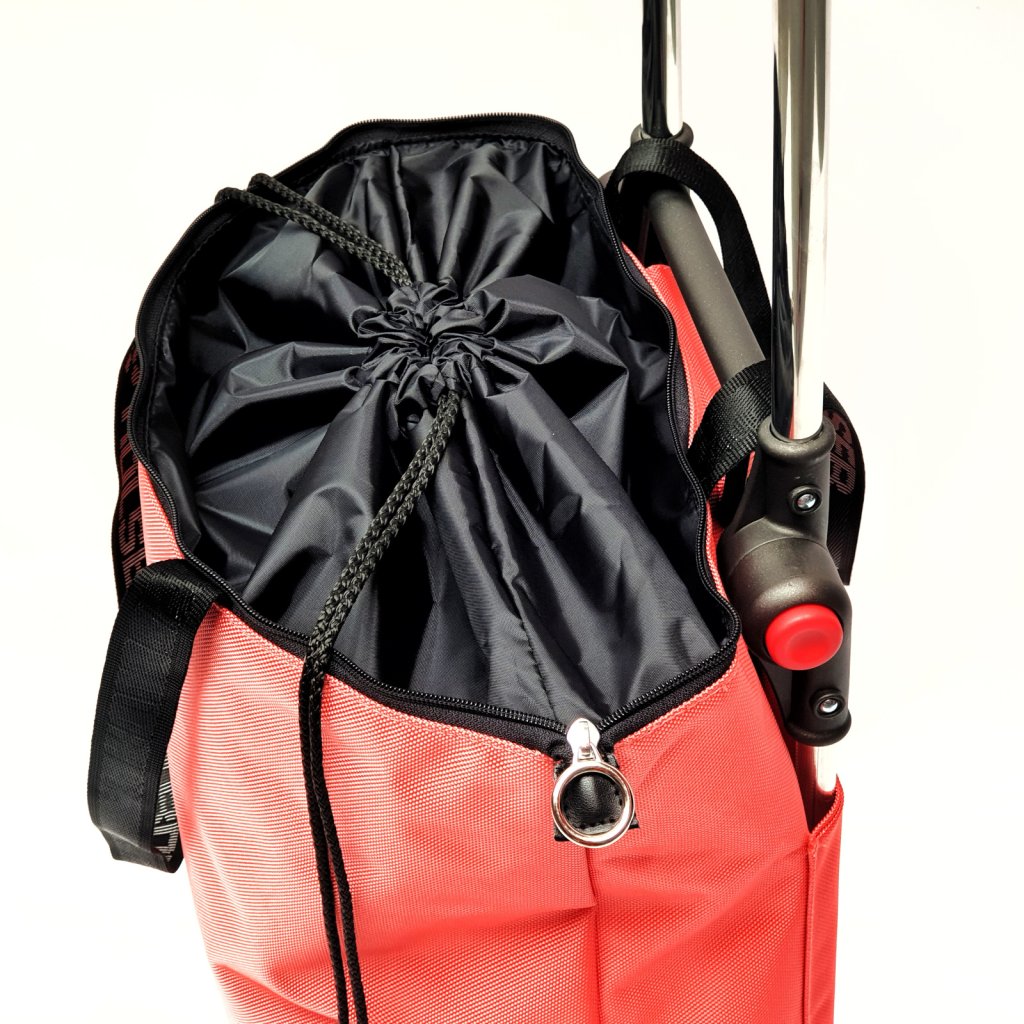 Hlavní úložný prostor tašky Mini Bag nabízí objem 15 L, který lze zvětšit pomocí všitého nástavce až na 21 L. Její maximální nosnost je až 40 Kg, avšak doporučené zatížení 25 kg. Vnitřní prostor je vybaven menší dvojitou kapsou na zip pro bezpečné uložení osobních věcí (peněženka, klíče, mobil), z vnější strany lze pak využít větší kapsu taktéž uzavíratelnou pomocí zipu. Zavírání tašky je řešeno zipem, ale v případě použití nástavce chrání nákup stahovací šňůrka. Taška je na vozík navlečena přes textilní tunel a v horní části připevněna suchým zipem, lze ji tedy použít i bez vozíku jako běžnou tašku nejen na nákup.