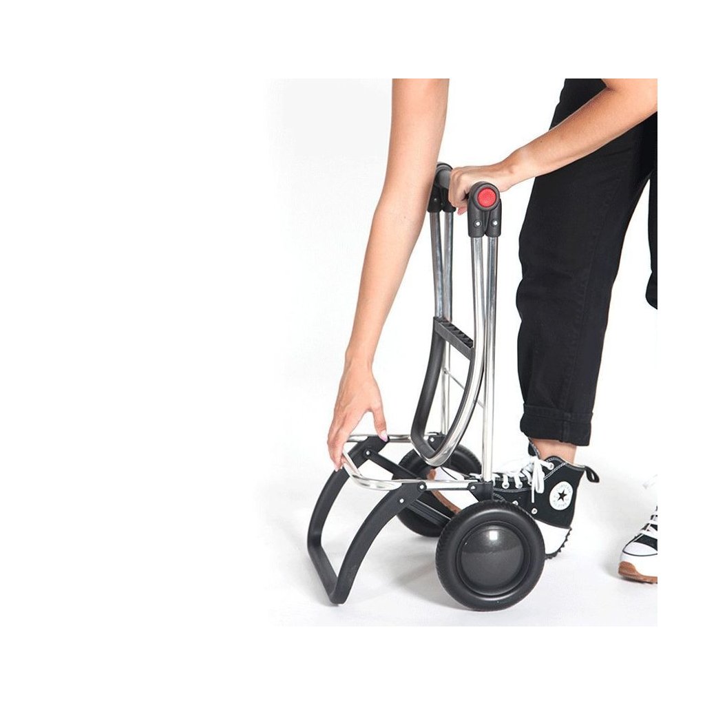 Lehká hliníková kostrukce Logic se dvěma koly klasické velikosti má hned několik praktických vlastností. Tou hlavní je bezesporu dvojitý skládací systém. Díky němu lze nejen složit přední oporu, která slouží k odstavení tašky do prostoru, ale také samotnou konstrukci. Pomocí bočních ovladačů (červené body) se totiž snadno složí na polovinu a lze ji pak jednoduše uložit nebo převážet v autě. Dalším praktickým doplňkem je integrovaný úchyt, který slouží pro zavěšení tašky na nákupní vozík a není tak nutné tašku nikde odkládat. Úchyt je zároveň opatřem drobnými háčky, které při provozu slouží k zavěšení klasických tašek či sáčků. Ergonomické protiskluzové držadlo zajišťuje komfortní úchop a přispívá tak ke snadné manipulaci. Výška konstrukce 105,5 cm je vhodná i pro uživatele vyšší postavy.
