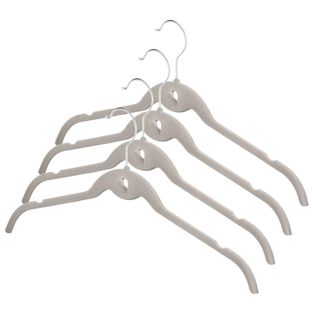 Nová ramínka od Compactor z řady Velvet jsou vyrobená z pevného plastu, který je potažený jemným béžovým sametem. Tato kombinace pevného plastu a jemného sametu je vyjimečná v tom, že samet působí jako protiskluzová vrstva a udrží na sobě i tu nejjemnější látku. Na každé straně ramínka jsou ještě drážky pro snadné uchycení oděvů. Ramínka jsou také vybavena ve střední části otvorem pro zavěšení dalšího ramínka. Při nedostatku místa ve skříni pak můžete sestavit svislou řadu ramínek a ušetřit tak mnoho místa.