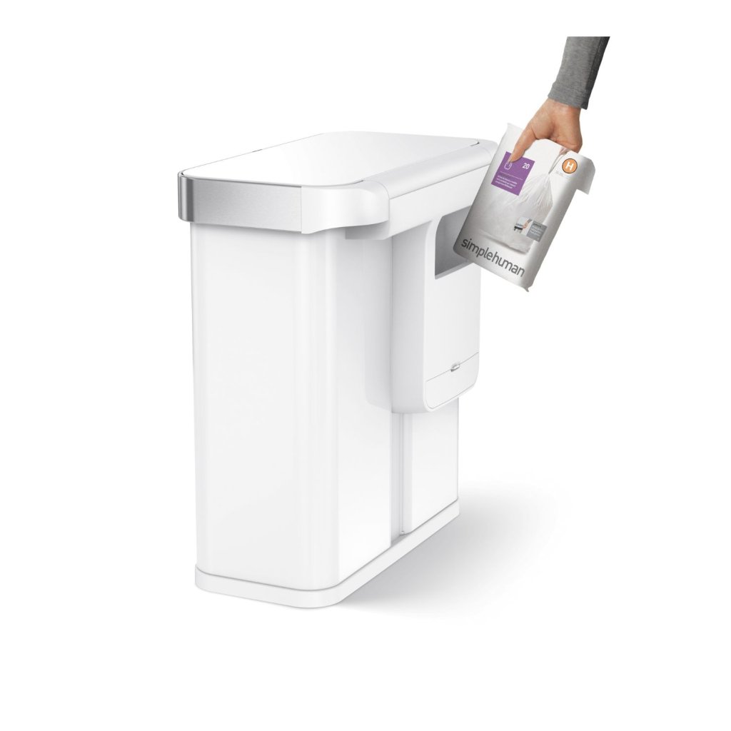 Díky vestavěnému zásobníku už nikdy nemusíte ztrácet čas hledáním náhradních sáčků do koše, budou totiž vždy při ruce. Z vnější strany koše jednoduše vložíte do zásobníku celé balení sáčků Simplehuman a z vnitřní strany je pak dle potřeby pohodlně odebíráte jednou rukou.