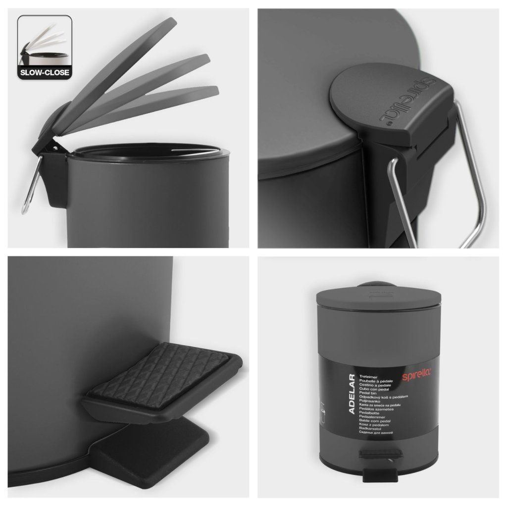 Pedálový odpadkový koš ze série ADELAR od švýcarské značky Spirella o objemu 3 L nabízí moderní design s elegantním matným povrchem, který se skvěle hodí do každé místnosti, ať už se jedná o koupelnu, toaletu nebo pracovnu. Je vyrobený z kvalitní oceli, což zaručuje odolnost a dlouhou životnost koše. Mezi jeho hlavní výhody patří pohodlné používání díky pedálu a mechanismu pomalého zavírání víka a snadno vyjímatelné vnitřní nádobě.