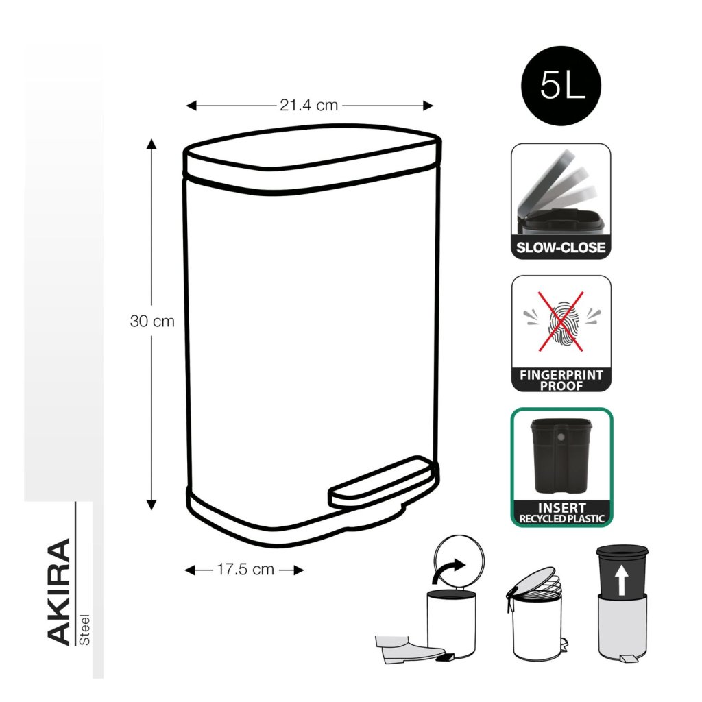 Pedálový odpadkový koš AKIRA od značky Spirella s objemem 5 litrů patří mezi menší koše, které se skvěle hodí do koupelny nebo na WC, kde oceníte hygienické otevírání bez nutnosti dotyku rukou. Zároveň perfektně funguje jako malý koš do pracovny či dětského pokoje – nenápadný, tichý a vždy po ruce. Vyniká matným minimalistickým vzhledem, který působí čistě, moderně a nadčasově.
