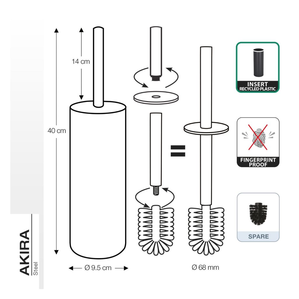 Vyrobena z vysoce kvalitní oceli, štětka kombinuje funkčnost a estetiku, čímž vytváří perfektní doplněk pro každou toaletu. Rozměry 9,5 x 40 cm a elegantní matná barva z ní činí stylový a praktický prvek do každého interiéru. Pro dokonalou koupelnu lze navíc tuto štětku snadno sladit s dalšími doplňky z řady Akira.