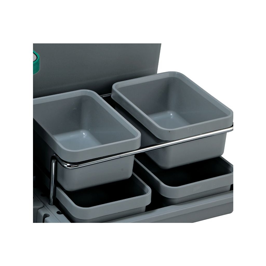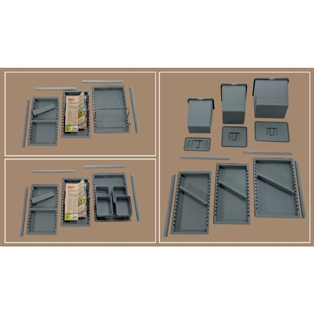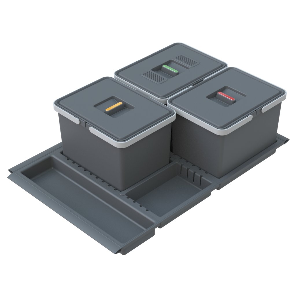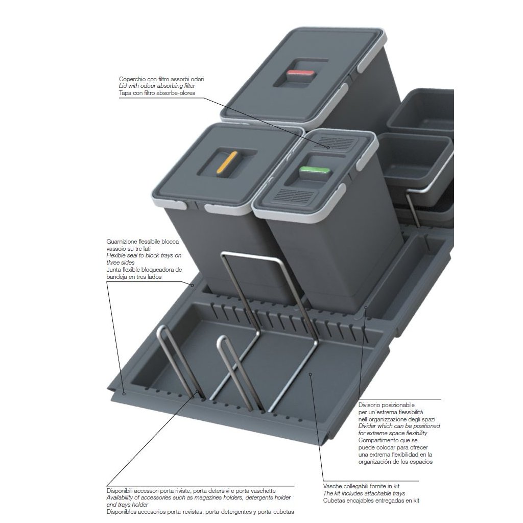 Všechny koše jsou umístěny v plastových flexibilních miskách a pomocí děličů je každý koš zaaretován ve své správné poloze. Plastové misky jsou pouze položeny na dně vysouvací zásuvky. Při vytažení zásuvky je tak ke každé nádobě dobrý přístup a to nejen při ukládání odpadu, ale také při výměně plného sáčku na odpad či vyjmutí celé nádoby mimo zásuvku